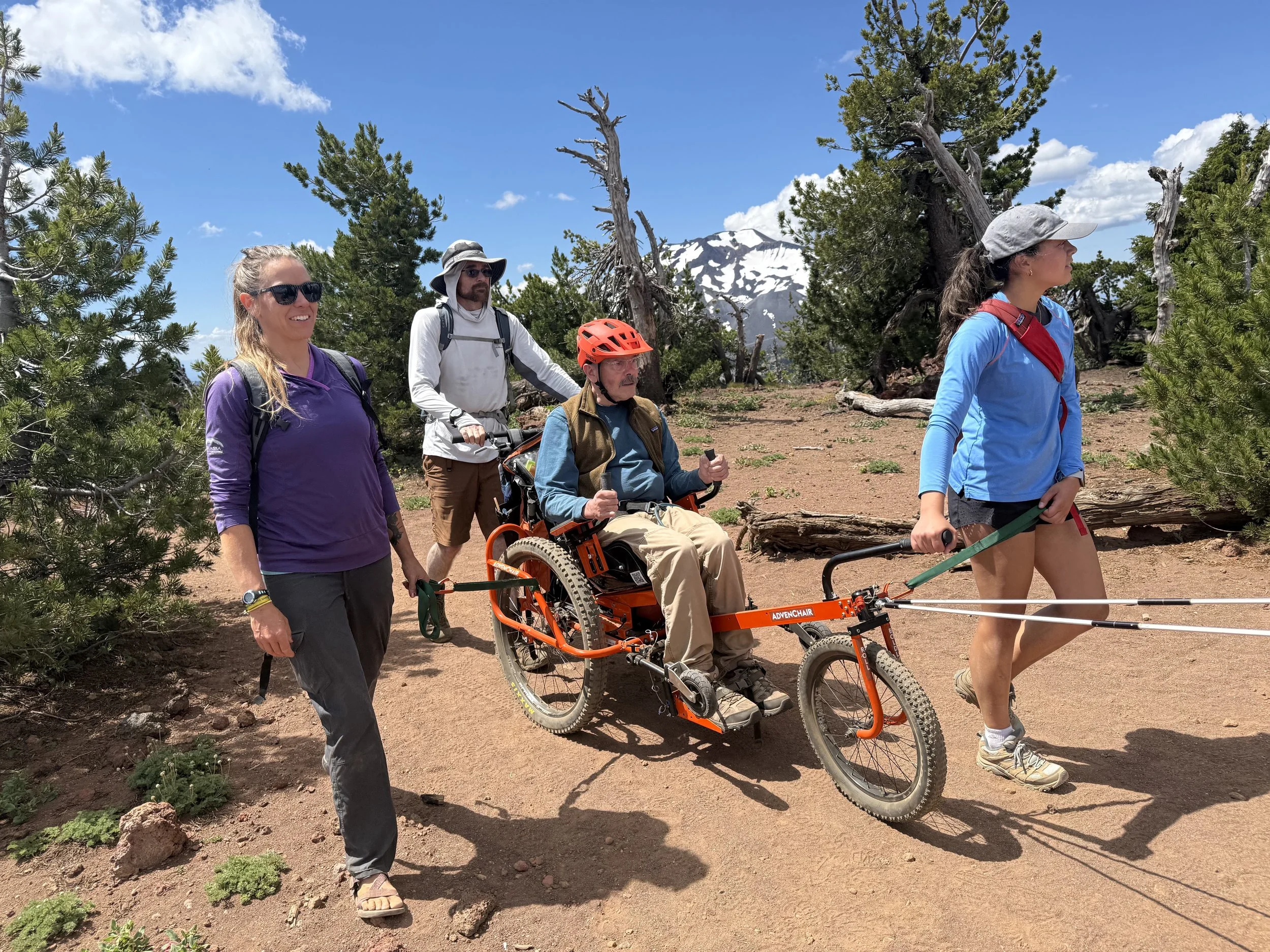 Kate Rodgers of the AdvenChair engineering development team steers Geoff Babb’s AdvenChair with the first version of the new forward beam handle, aka “The Stinger,” on a Tumalo Mountain hike in Central Oregon